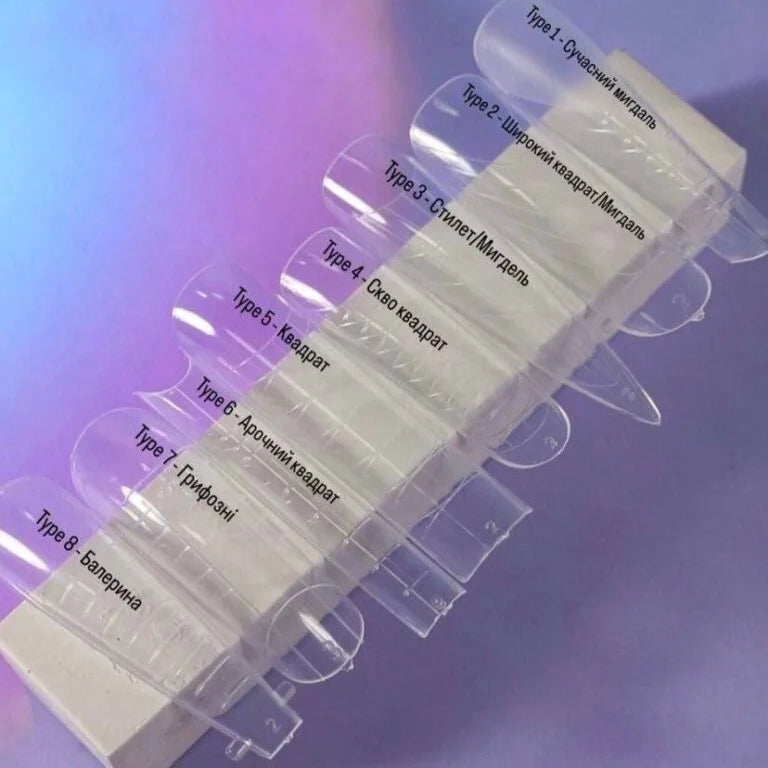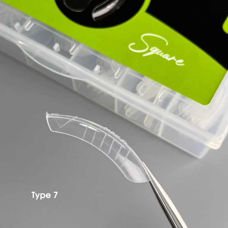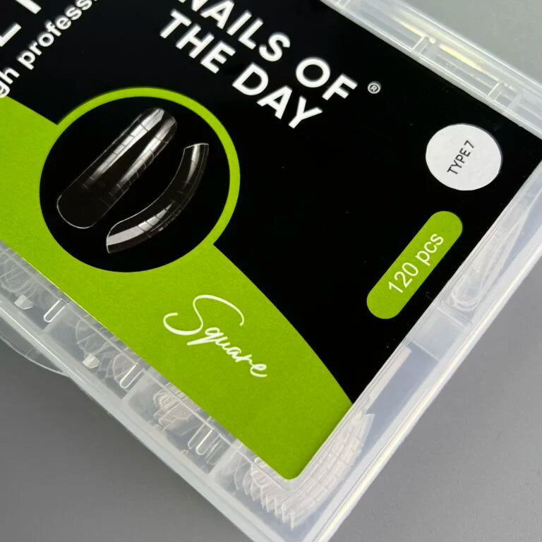 Type 7 — Quadrat für mittellange Verlängerungen, geeignet für nach unten wachsende Nägel, 120 Stück. Im Set befinden sich 120 Stück in 12 Größen, die es leicht machen, die passende Form für jede Nagelplatte auszuwählen.